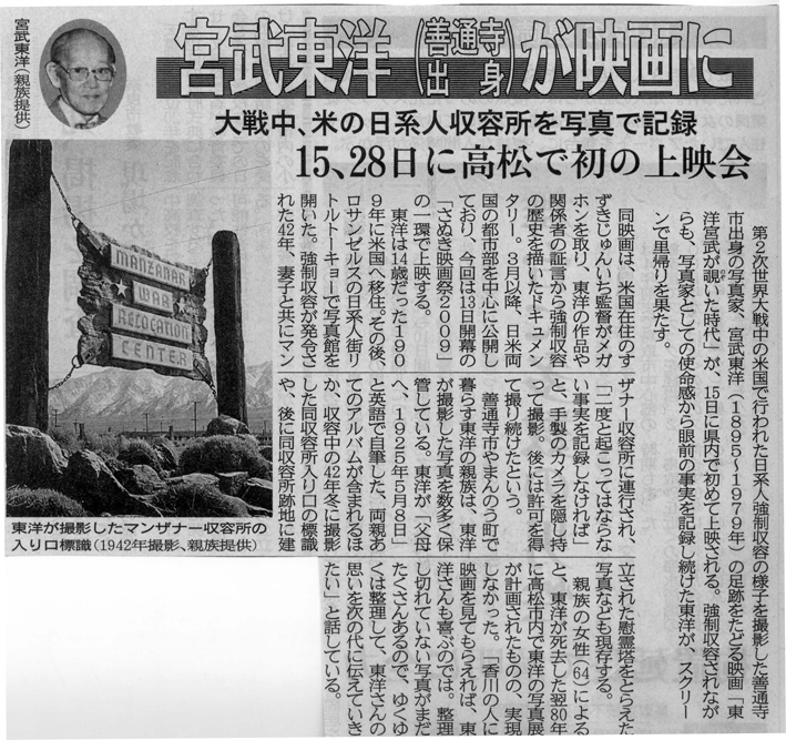 官武東洋男は1895(明治28)年、香川県仲多度郡満濃町公文で生れ、幼時を善通寺市で過した。先にアメリカへ出かせぎに出ていた父に呼び寄せられて 一家が渡米したのは1909年、東洋は高等科4年に在学中の時であった。母、兄、弟と東洋男の四人は日本郵船・丹後丸で神戸からシアトルヘ向った。 上陸先をシアトルにしたのは「移民の取扱いが、サンフランシスコよりシアトルの方がよほど寛大だから」という父のアドバイスに従ったからである。 一家はロスアンゼルスの、当時のチャイナタウンで父が経営していた菓子屋「松風堂」うらの住宅におちついたが、程なく店とともに下町のジャクソン街に移った。 東洋男ら三人の兄弟はアメーリアストリート・グラマースクールへ入学した。初日に校長から名前を訊かれて答えると、「東洋男では長すぎるからトーヨーにしたら」 と校長は言い、彼は「よろしけれは……」と答えた。以来、自らも東洋を名乗るようになった。 当時のロスアンゼルスでは東一街とサンビドロ街、それからジャクソソ街周辺に、いわゆる日本人町が出来上っていたのである。 父に呼び寄せられたアメリカで、どんな職業で身を立てたらよいか − 捜し求めるうちに2年が過ぎた。その間、東洋はフレスノの日本人経営の農園でブドウ摘みの アルバイトをして稼いだ。 ロスアンゼルスに帰って、思い屈しながら荷を歩いているとき、突然、脳裡にひらめくものがあり、東洋は思わずひとりごとに、「オレは写真屋になるんだ」。 のちになって彼は写真師になった遠因をこのように語っている。 「私は小学生時代から絵が好きで、将来は画家になりたいという淡い夢を抱いていたが、母に猛反対された。絵かきではメシが喰えない、というのが反対の理由だった」。 絵から写真 − の連想が一瞬のうちに働いたのであろうか。 数分後、東洋は街頭で親しい友人に出会い、早速胸のうちを打明けると、その友人は「それはまったく君の素質に合っている。向う(道の反対側に見えるトモエホテル を指して)の二階でハリー重田さんが写真館を開いていて、写真術講習のクラスもある。重田さんに会ってみたらどうか」と言ってくれた。東洋はその足で重田氏に 会って希望を述べ、講習会に入れてもらうことになった。 ハリー重田はその後、シカゴに移り、ライトと共同で「シゲタ・ライト・フォトスタジオ」という大きなスタジオを開いて成功した。重田の考案した商業写真の方式は 全世界に拡がっている。 東洋スタジオ 1923年9月、28歳の東洋は東一街にあった、その名も「東洋写真館」を譲りうけて一城の主となった。買いとったのが自分の名前と同じ名称の写真館だったのは まったくの偶然だったが、それも幸運のしるしのように、東洋は感じたことだろう。その前年の1922年、彼はひろ子と結婚、1924年には長男アーチー淳文が 誕生している。順風満帆であった。 東洋は、グレソデールでスタジオを開いていた、当時、世界的に有名な写真家、エドワード・ウェストソと親交を結び、彼の指導を受けて写真技術の向上につとめた。 1924年ロスアンゼルスの日系人が集まって開かれた初の芸術写真展で一等賞を得たのも、この精進の現われであった。舞踏家として著名だった伊藤道郎が、 かけ出しの写真家である東洋をハリウッドの有名人に紹介してくれたことも幸いした。1926年、ロンドン万国写真展に出品して入賞、全米各地で開かれる芸術 写真展にも度々入賞するなど、東洋の写真家としての評価はおおいに上った。 しかし、盛業に反して宮武一家の経済的状況は若しかった。東洋の経済感覚はゼロに近かったのである。夫人ひろ子の苦労は絶えなかった。 1932年に開かれたロスアンゼルスオリンピック大会では競技の写真撮影に当っただけでなく、自費を投じて朝日新聞社の報道写真の日本直送の便宜をはかり、 大いに感謝された。この年、母とともに日本へ帰っていた父の病が篤くなった。東洋夫妻は長男と次男バービーを連れて帰国する決心をした。しかし、帰国の旅費もない。 彼は羅府新報社長の駒井豊策や三好峰人らの助力を得て写真展を開き、どうやら族費に足りる収入を得た。しかし、洋上の浅間丸で、一家は「父病急変他界」の報せを 受けたのであった。一家の日本滞在は一年で終った。故郷で写真館を開いて暮そうという東洋の望みは実現しなかった。東洋はとりあえず妻子を残して、再びロスアンゼルス へ戻った。ロスアンゼルスを永住の地と心に決めたのはこの時である。 ちょうどセントラル街角に空店があったのを借り、しまいこんでおいた機材を取り出して「東洋官武スタジオ」は再スタートを切った。こんどの店は地の利にも恵まれて 繁昌した。伊藤道郎が主宰する舞踏団がハリウッド・ボウルに出演して絶讃を博したのもこの頃である。この公演の指揮者として日本から招かれたのが近衛秀麿である。 東洋と近衛との親交はこの時から始まった。伊藤道郎の依頼で公演の写