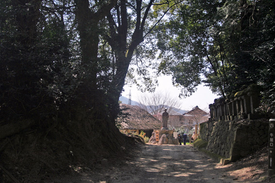 高松城下からの道あるいは阿波からの道、今に人口に膾炙しているのが伊予、土佐街道であろう。今日も国道377号線は俗に伊予街道と言われ、琴平に近い 峠を伊予見峠と呼んでいる。そこまで来ると伊予がはるかに見えると言うわけで、往時に金毘羅参りの人々もほっとしたのだろう。 幕末、榎井在住の勤皇派の日柳燕石を密かに訪ねてきた高杉晋作は愛人おうのを連れてこの道を通って来たかもしれない。今日のまんのう町になる佐文から 国道と分かれて三豊市高瀬町に入る県道を象頭山に入る道があり、これが往時の金毘羅道で俗に言うところの伊予街道の名残である。現在は近くにある琴平 バスの脇から早道がついている。 この道を行くと自動車で本宮の大門の下まで行ける。この上り口を牛屋口と呼んでいる。伊予街道は伊予三島で土佐街道と合流しており、この牛屋口は標高 172メートル、御使者口とも呼んでいる。かって土佐藩や伊予八藩の諸大名がここを経て参拝していた名残である。この古事から御使者口と言うように なったとも言われる。その場所は琴平町域でなく、まんのう町域になる。 この峠一帯がかって賑わっていたことは、今でも伊予や土佐の人々の名を刻んだ石碑や並び灯篭がずらりと並び往時の面影を残している。讃岐に流された時 に法然もこの一帯にいたこともあり、そこを円空バエと呼んでいる。円光は法然の大師号の一つで、ハエと言うのは林と害う意味である。 琴平、榎井一帯で幕末には燕石らの勤皇派が集い、晋作はじめ美馬君田、長谷川佐太郎、小橋安蔵らが倒幕に力を入れていた。土佐の坂本龍馬も脱藩して 勤皇に走っているが、讃岐に来たた史実はないようである。(実際は丸亀に逗留の史実があります。) しかし牛屋ロには、土佐の桂浜に建っている懐に手を入れた龍馬像が宮に向かって建っているのである。琴平バスの創設者である楠正晴氏が昭和63年に 牛屋口の上にお祭り広場を計画。そのころは瀬戸大橋着工の時期であり、地域発展を期待して建立したようである。 今ではほとんどの人が知らないが、今年ちょうどテレビドラマで『龍馬伝』が放映されており、ぜひこの銅像を見てもらいたい。龍馬像は九州の五島列島 にもあり、脚光を浴びている機会である。 (高松短期大学教授・津森明) |