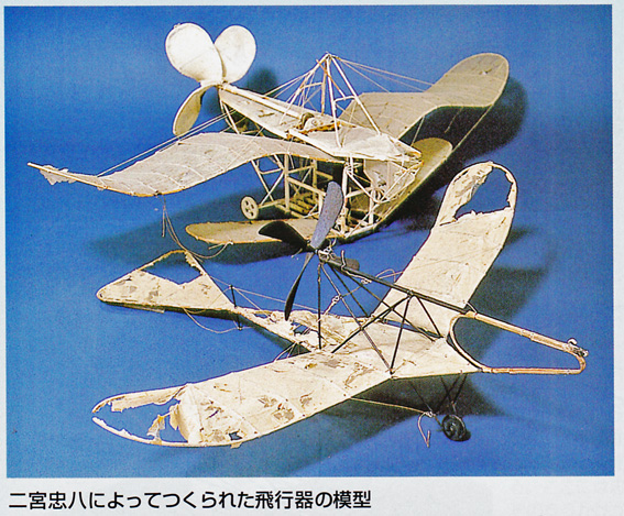 1866(慶応2)年、二宮忠八は、愛媛県八幡浜の海産物問屋を営む裕福な家庭に生まれた。だが、生後しばらくすると、父親が商売に失敗して他界。忠八は幼い頃か らいろいろな仕事をして家計を助けたという。 成人した忠八は、衛生兵として入隊。そして1889(明治22)年、羽ばたかずに滑空するカラスの姿を見て「翼で風を受け止めることができれば、空を飛べるはずだ」 という飛行原理を着想。その2年後、ゴム動力による「カラス型模型飛行器」の飛行実験を成功させた。続いて忠八は、人間が搭乗できる「玉虫型飛行器」の設計に着手。 ライト兄弟よリ10年も早い快挙だったが、開発を軍に上申したところ、あっけなく却下されたのだった。 飛行原理を確立していた忠八の課題は、動力の問題に絞られていた。開発資金を得るために軍を離れた忠八は製薬会社に入社。その収入を使って実験を重ねた結果、石油発動機 に目をつける。そして、12馬力エンジンを入手しようとしていた矢先、ライト兄弟の成功を新聞で知ったのである。大きなショックを受けた忠八は、ほぼ完成していた 玉虫型飛行器をハンマーで打ち壊し、以降、一切の研究開発を放棄してしまった。37歳だった。 1991(平成3)年、日本大学理工学部が忠八の残した設計図から玉虫型飛行器を復元し、12馬力エンジンを搭載して飛行実験を行なったところ、機体はみごとに宙を舞った。 彼の上申を軍が聞き入れていれば、飛行機発明の栄誉は日本人の頭上に輝いていたのではないか?そう考える識者は少なくない。 |