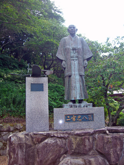 今からおよそ百年余りも前のことです。当時、丸亀城内にありました丸亀歩兵第12連隊に、1人の名物男がいました。その人は、世界で最初に飛行機の原理を思い付いた 二宮忠八という兵隊さんです。 忠八さんは、愛媛県八幡浜の生まれですが、明治20年(1887)に看護卒として丸亀連隊へ入営しました。 その翌々年の晩秋、阿讃山脈のふもとで演習があり、その帰り道のことです。一行が、仲多度郡十郷村(現仲南町)の樅の木峠で昼食の大休止をとりました。そして、ふたたび 行軍に移ろうとした時のことです。兵隊さんたちの食べ残した弁当をねらって、どこからともなくカラスの大群が道路すれすれに滑空してきました。部隊の最後尾にいた忠八さんは、 カラスが残飯に近づく時、翼の動きを止めて硬く張ったまま水平に飛ぶしぐさを見て、ハッと頭にひらめくものがありました。−推進力さえあれば、翼を上下に動かさなくても、 飛ぶことは可能である。−と、直感したのです。 忠八さんは、その後、空を飛ぶ小動物を詳しく観察する一方、軍務の余暇をみては、丸亀港のほとりにあった福島橋から傘を差して、何回も何回も海中に飛び込み、空気の抵抗 などの研究を続けました。そして、明治24年(1891)に船のスクリューに似たゴムの推進器を付けたカラス型模型飛行機を作り、夜間ひそかに練兵場で実験し、ついに30m の試験飛行に成功したのです。 カラス型模型飛行機に勇気づけられた忠八さんは、さらに改良を加えた玉虫型飛行機の設計図に上申書を添えて軍の幹部に飛行機の試作を訴えましたが、「人間が空を飛ぶなんて 夢のようなことだ」と、聞き入れてもらえませんでした。 アメリカのライト兄弟が初飛行に成功したのは、その12年後の明治36年(1903)のことでした。 |