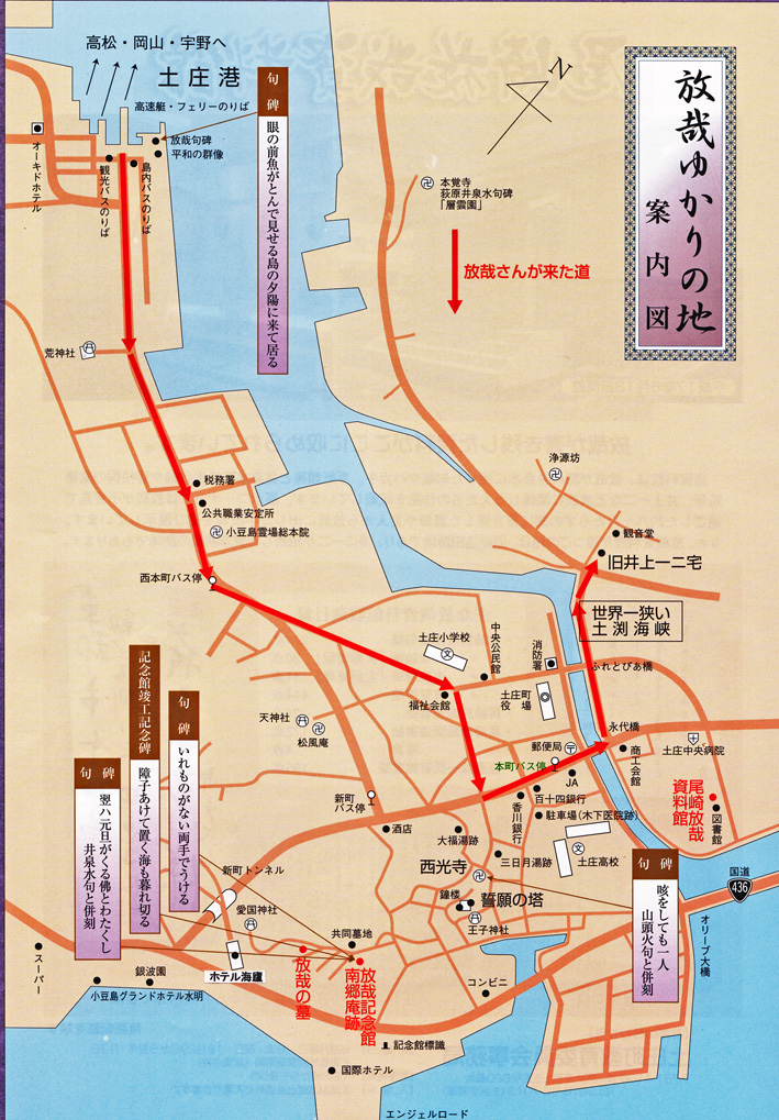 一高時代、一級先輩の自由律俳句の荻原井泉水を知り師事した。井泉水の紹介で、小豆島の井上一二(文八郎)を頼って来島。西光寺住職杉本玄々子(宥玄) の好意で、大正14年8月20日から、西光寺奥の院南郷庵(みなんごあん)の庵主として居住。行住坐臥、俳三昧の生活を営むが、極度の栄養失調と持病 を悪化させた。近くに住む漁師夫婦の看病にもかかわらず翌年の4月7日入寂。 享年42才.戒名 大空放哉居士 |