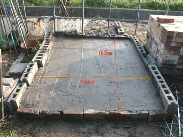 2002.3.14 用水路に溜まっている泥砂を一輪車で運び、水、セメントを混ぜてコネテコネテ混ぜて混ぜて。 やっと基礎部分をセメントで固めました。(セメント25kg*2袋)1000円也 これだけの事をするにも、ヘトヘト。