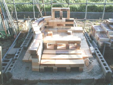 右側のレンガの積み方が直線的な事にお気付きでしょう? 積みながら気が変わり、登り窯の様に横から焼き物を出し入れしようかな、 と思った訳です。