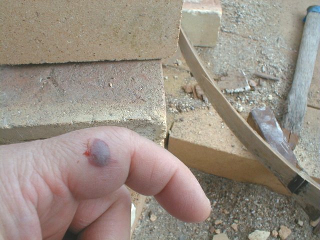 右上の石工用の金槌の柄、はずれてしまい、傍らのレンガで叩いていて人指し指を叩いてしまいました。