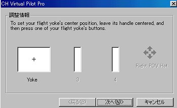 調整画面がでます。 左から順番に、指示通りに調整します。 aまずジョイスティックのボタンを一回押す。するとメッセージが変わります。 b前後左右にジョイスティックを5〜6回いっぱいに動かし、又ボタンを押す。 cメッセージ通りに進みます。 dスロットル(3)ラダー(4)へと進みますが同じ要領で進みます。 (注)Yokeの画面で最初+のマークがセンターよりずれていることがあり、ジョイスティックを動かしてもやや狭い範囲しか動かないことがありますが、調整後テストの画面で+が真ん中にきて、ジョイスティックを動かしたときに画面いっぱいに動けばOKです。 |