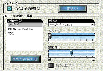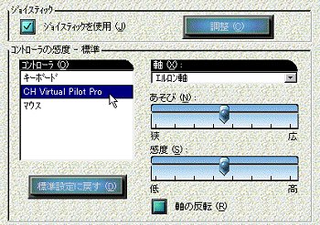 実際に何回も飛んでみて、感度が高すぎると感じたら、左のようにコントローラで自分のジョイスティックを選び「エルロン軸」など各軸の感度とあそびを適当にゆるめてみてください。 これで軽微な不調はカバーできます。 |