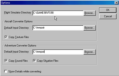 Input Directory」の所に設定します(例えば私は「tempair」という名前のフォルダをコンバート専用のフォルダとして前もって作っておきましたのでここではtempairと指定しています。) Flight Simulator Directoryは始めに説明したとおりです。FS98のフォルダを指定します。 これで準備オーケーです。「OK」を押して閉じておきます。 (一番下のますにチェックを入れますと、コンバート中の状態を表示してくれますが、まあどちらでもよいですね。) |