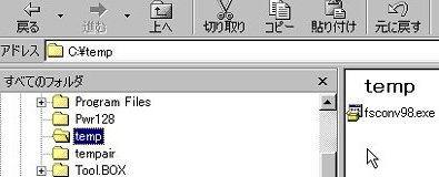 この場合はtempフォルダに移す必要は特に無いのですが、とにかくfsconv98.exeをダブルクリックします。 作業終了後はこのファイルをどこかに保存しておきます。再インストールの必要がでてくることがあります。 |