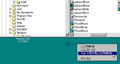 デスクトップにショートカットを作ります。 aafconv98.exeをクリックして色を反転し、右クリックしてそのままデスクトップにドラッグします。 「ショートカットをここに作成」をクリックします。できたらデスクトップ上の好きな位置にドラッグしてください。 |