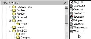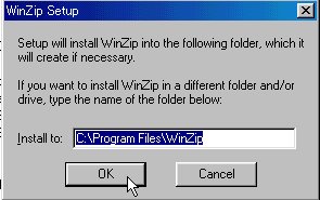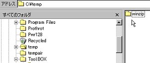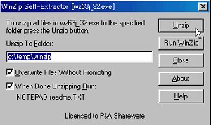 自己解凍式ですので、解凍先を聞いてきます。 適当な空のフォルダ(例c:\temp\winzip)を指定します。 (注)c:の次に/の反対向きの記号がでています。 これはバックスラッシュといい\と同じものです。キーボードで\を押すとそのままの記号がでるときと、バックスラッシュがでるときがあります。 |