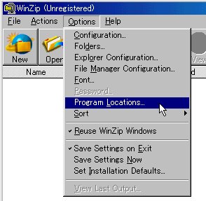 インストールが完了すると、デスクトップにWINZIPのアイコンができるはずです。 なければ作ってください。 又、tempフォルダの中はインストール後全部削除します。 ところで、このままではLzh形式の圧縮ファイルが解凍できません。そこで、このファイルも解凍できるように設定をします。(この設定の前にLHAをインストールしておきます) デスクトップのアイコンをダブルクリックするとWINZIPのファイルが開きますので、OptionからProgram Locationsをクリックして、 |