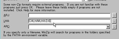 開いたファイルの画面のLHAの所に左のように C:\LHA\LHA . EXE と入れます。 これで準備完了です。 |