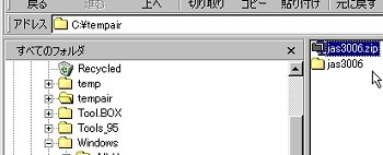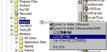 jas3006.zipを空のフォルダ(tempair又はtempフォルダ)コピーします。(コピーはzipファイルをクリックして色を反転し、次に右クリックしたままコピーしようとするフォルダまでドラッグします。左のようにコピー先のフォルダの色が変わるところまでドラッグして一旦手を離しますと、左のような画面になりますので、「ここにコピー」を選択します。) |