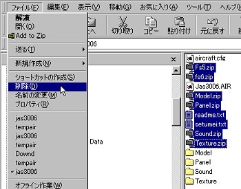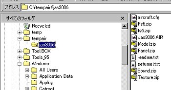 Model.zipとPanel.zipとSound.zip及びTexture.zipをダブルクリックするとjas3006フォルダの中にそれぞれの名前の付いたフォルダが出来て、同じように解凍されます。 setumei.txtは必ず読んでください。 Fs5.zipとFs6.zipは要りません。 |
