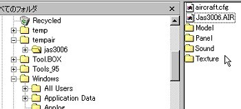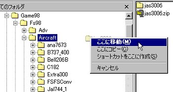 できたjas3006のフォルダをFS98のAircraftフォルダにコピー又は移動します。(移動するには目的のファイルなりフォルダをクリックしたまま移動先のフォルダまでドラッグして手を離せばそのまま自然にはいるのですが、うっかり隣のフォルダに入れる危険があります。それで先に説明したように右クリックをして移動先を目で確認してから入れた方が手堅く安全だと思います。) |