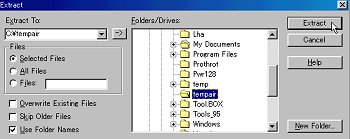 解凍先には自分で決めたコンバート専用フォルダの「tempair」を指定します。 同じくExtractをクリック。 |