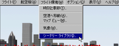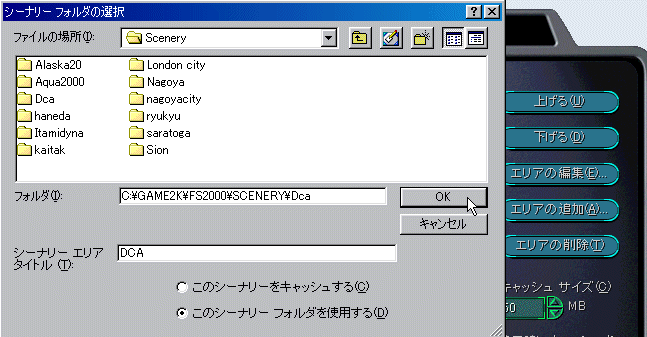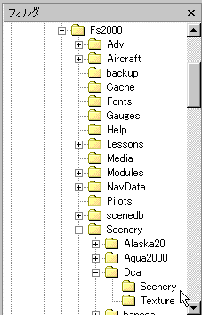 今回入れようとしているシーナリーは下記のように「Dca」というフォルダ名になっています。その中にSceneryとTextureの二つのフォルダがあります。WINDOWSのエクスプローラを開き、ダウンロードしたファイルを先ず下のように入れておきます。![]() 次にFS2000を立ち上げます。 ![]() FS2000の画面のシーナリーライブラリをクリックしますと下の画面が出ます。