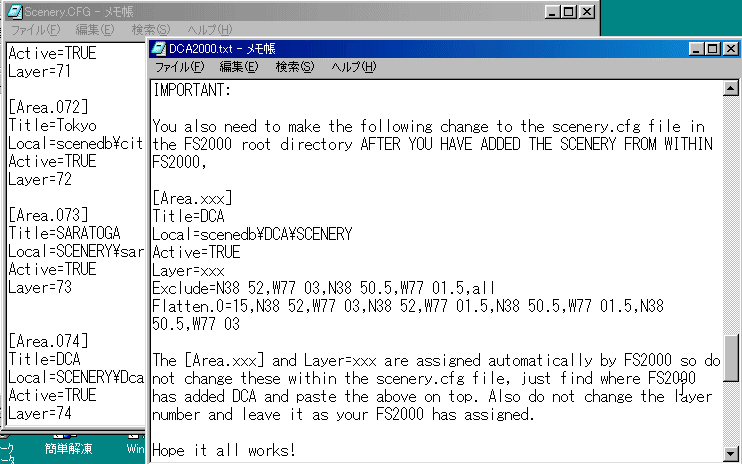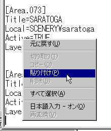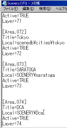 Scenery.cfg のデータが表示されます。 一番下に、今入れた新しいエリアが自動的に追加されています。 次に作成されたエリアのLayer=74の下側に必要な項目を追加します。 |