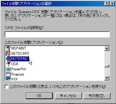 FS2000のフォルダの中のScenery.cfgを右クリックして、「アプリケーションから開く」を選択します。 左の画面のように、NOTEPADを選び、「このファイル・・・」のところのチェックをはずして「OK」をクリックします。 |