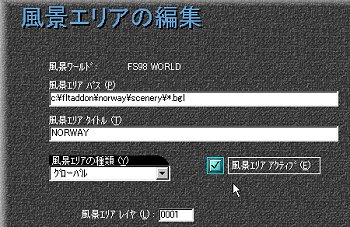 風景エリアパスはc:\fltaddon\norway\scenery\*.bglです。 |