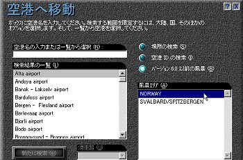 NORWAYに移動するときは「バージョン6.0以前の風景」をクリックしてください。そうするとその下の「風景エリア」に表示されますので、目的の空港を選びます。 |