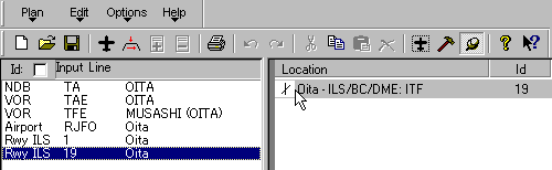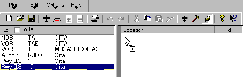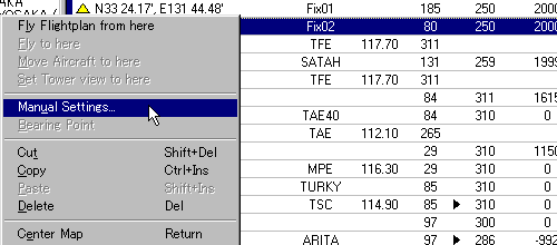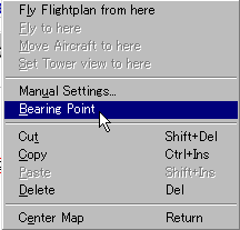 ベアリング(VORラジアル等)による位置の修正、そして各ウェイポイントでの高度・速度の修正をします。 (作者注) 滑走路の延長線上最低 5nm先に fix-pointを入れてください。航空機がきれいに離陸できます。 滑走路の延長線上の適当なところにマウスポインタを当て、押しますと左の様なマークが出ますのでそのままドラッグします。 |
