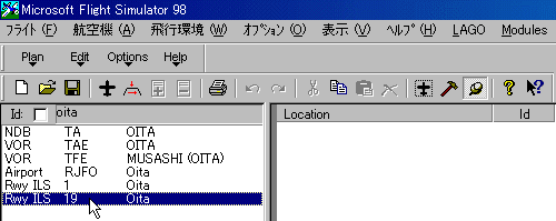 C出発空港を入れます。 Locationに入れますが、方法は、 A地図から直接ドラッグする。 B地図の目的のポイントにマウスポインタを当てますとポップアップメニューが出ますので、<To Flightplan>をクリックする。 Cこの画面のようにIDで検索する。 の3つの方法があります。 |
