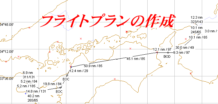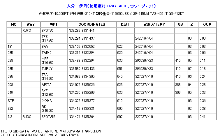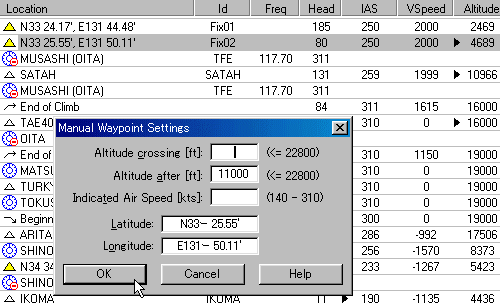 これが完成したフライトプランです。 この中のどの行でも、ダブルクリックしますと、該当する場所が地図の真ん中にきます。 実機の状態をよく知らない部分もありますので、参考程度にしてください。
