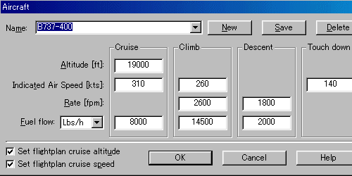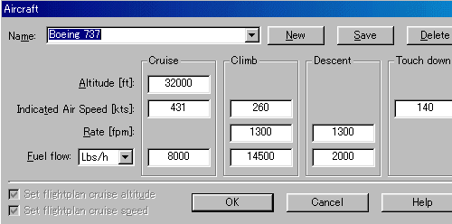 Aまずプランで使用する航空機をあらかじめ選択します。この画面はデフォルトのままの状態です。 一応、OKで閉じておきます。 |