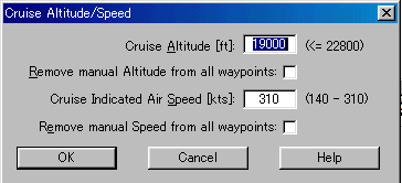 B次に、メニューの Plan→Cruise Altitude/Speed...を選択しますと、この画面が出ます。 ここでプランの基礎データを入力しておきます。 巡航高度 19000ft、 巡航速度 310ktsですね。 |