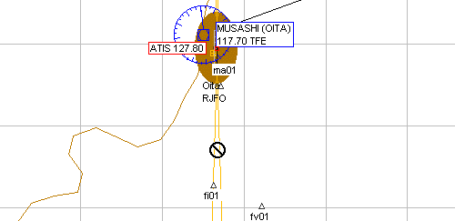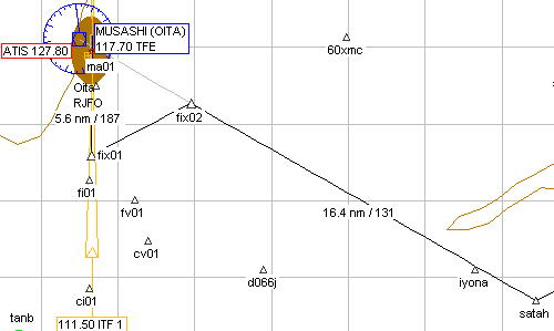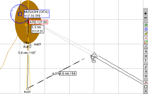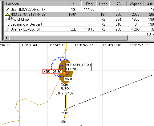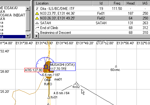 そうしますと、MUSASHI VORからfix02への方位と距離がグレーの線で表示されます。 ここでMUSASHI VORに対して正確な方位と距離をfix02をドラッグしながら決めます。今修正して表示されているのは、5.3nm,131度ですね。 このように、ベアリングポイントは、フライトプラン画面で一行前のウェイポイントに関してのデータを表示します。 |