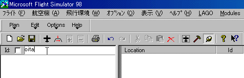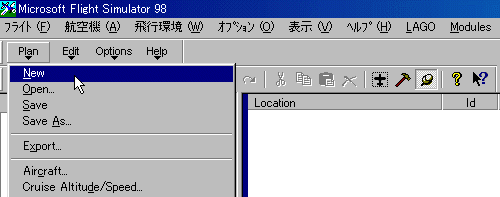 @新しいフライトプランの作成です。 Plan→Newをクリックします。 Locationとあるところがフライトプランのデータを入れる画面です。 |