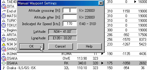 F各ウェイポイントごとでの速度・高度の設定は、行のところで右クリックしますと左の画面が出ます。 この設定では、使用する航空機の特性に反する値を入れても受け付けません。記入できないときは、航空機の特性を見直してください。 |