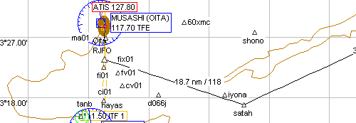 <SATA TWO DEPARTURE(サタ2ディパーチャー)> 大分空港R/W19を離陸後左旋回(01なら離陸後右旋回)、武蔵VOR/DMEのラジアル131度をサタビクター(SAV)に向かう。 以上の作業で、ここまでのコースができました。 このようにして、最後までのコースを順番に入れていきます。 |