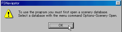 FS98をスタートします。 F9キーを押すと画面がFSNavigatorに変わります。(又はFlight からもできます) 始めての時は、このメッセージが出ます。 |