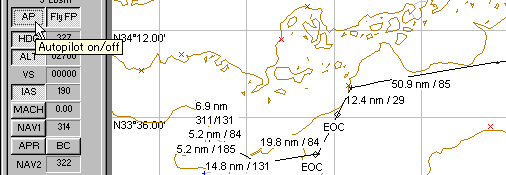離陸後、オートパイロットのスイッチ(AP)をオンにしますと、(キーボードのZキーを押す。大型機の場合はマウスでパネルのスイッチをクリックしても良い)自動操縦が始まります。F9キーを押してFSNaviggatorの画面を見ると、Autopilotのところが押し込まれているのが判ります。 |