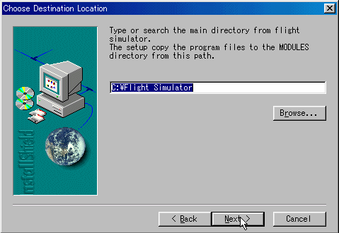 この画面で、ハードディスクのFS98の入っている場所を指定します。 左の例はハードディスクにダイレクトにFS98を入れている場合ですね。 例えば、私の場合ですと C:\Game98\Fs98 となります。 ここの場面を間違わないようにしてください。 |