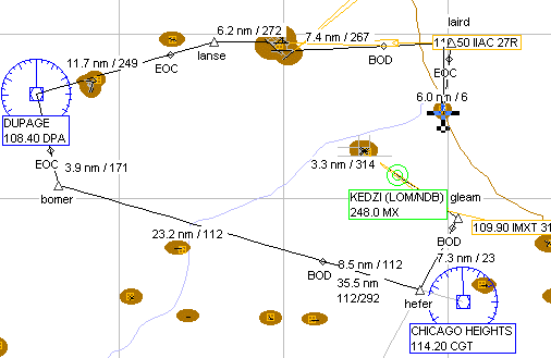 FSNavigatorの画面を見ていると、設定したウェイポイントで旋回するのが判ると思います。 この場面の時に、フライトプランの画面は左のように次のポイントの(BOD)マークが赤い枠で囲まれます。 |