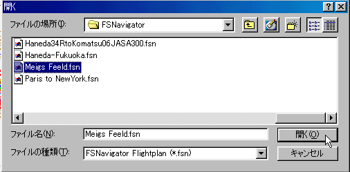 FS98をスタートした後、F9キーを押してFSNavigatorの画面にします。 そのままですと、FS98 は普通はメイグス飛行場にセスナスカイレーンがいますね。 左の、Plan⇒Openか又はアイコンのOpenを開きます。 |