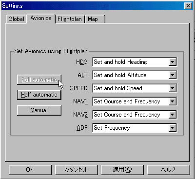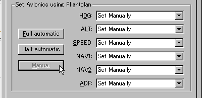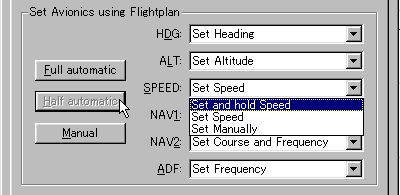 V3で新しくなった機能です。 自動操縦で航空機をコントロールする設定が、この場面で選択できます。 左のように、<Full automatic>を選択しますと、ご覧の各設定は全てFSNavigatorによる自動操縦になり、目的地までなにもしなくても飛んでいきます。 |