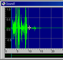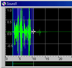 録音が済むと左のような音声画面が出ますので、音の始まりの部分から終わりの部分まで必要なところだけをとります。 矢印のアイコンが左の画面のように変わります。 先ず音声の始まり部分の所を左クリックしますと、色が変わります。 |