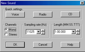 GoldWaveを起動して「NEW」をクリックしますと左のような画面が出ます。音声の録音する設定をします。 はじめに、左のような設定値の画面が出ますがこのままでよいと思います。 Quick settingsはVoiceですね。 |