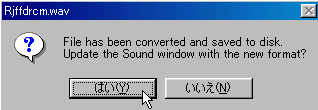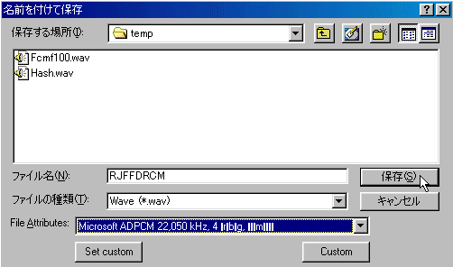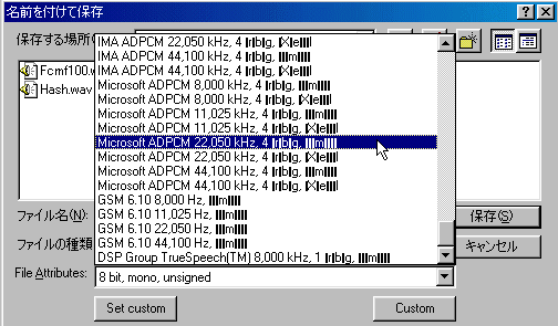 as>で名前を付けて左のような設定で保存します。 ファイル名は、大文字で残したいときは拡張子(.wav)を入れなければ大文字のままのファイル名になります。 保存先は好きなところを決めて下さい。 出来たファイルをアドベンチャーのWavフォルダに入れます。 |
