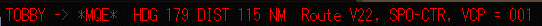 Ctrl+E でエンルートステータス(航空路を飛行中の状態)を表示します。これは千歳を出発してまもなくの状態です。 TOBBY -> *MQE* 現在飛行中の位置を示す。TOBBYからMQEへ向かっています。 HDG MQEへのヘディング DIST(NM) MQEからの距離 Route 現在のルート SPO-CTR 現在管制下にあるコントロールセンター VCP=001 Vurtual Co-pilotのON/OFFの状態。001はオン、000はオフ |