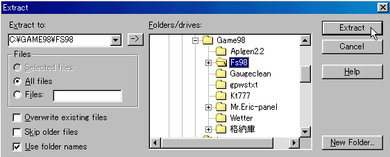 ZIPファイルから直接左のように自分のFS98のフォルダに解凍します。 その時「Use folder names」にチェックが入っているのを確認してください。 |