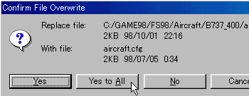 途中で「上書きしますか?」というメッセージが出ます。 Yes又はYestoAll をクリックします。ここでB737_400のaircraft.cfgは上書きされます。 |