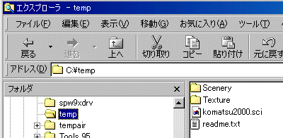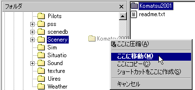 そこで、「Komatsu2001」という名前のフォルダを作り(好きな名前でよいですけど)そこにSceneryとTextureフォルダを入れました。 Readme.txtファイルはそのままです。 |