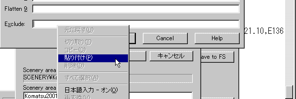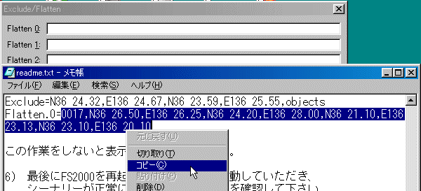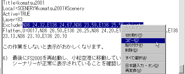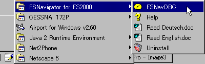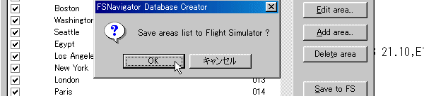 このように作者の指示通りに入れます。 後はOKで閉じていきます。 ここまでの作業でFSNavigatorのデータベースは変更されました。 が、FS2000の方は変わっていません。 そこで、 |