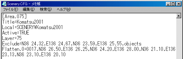 後からFS2000のメインフォルダの中の、Scenery.cfgを開いてみますと、左のようにKomatsu2001が加えられています。 |