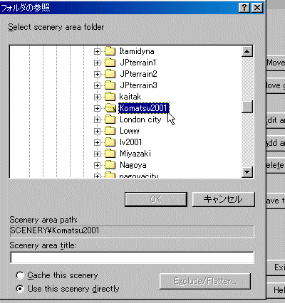 area path:」の所に「SCENERY\komatsu2001」というパス名が表示されます。 表示されましたら、その下側の「Scenery area title:」にタイトルを入れます。 ここでは「Komatsu2001」と入れました。 |